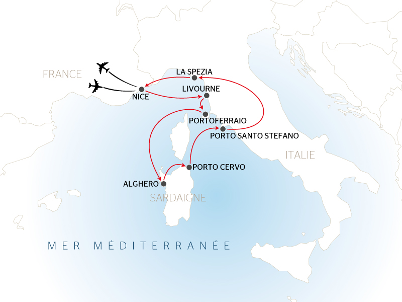 Au cœur de la Toscane, le génie italien s’est manifesté avec éclat du XIIe au XVIe siècle et sera à l’origine de la Renaissance, mouvement qui va traverser l’Europe entière. Florence, véritable ville-musée, ou encore Lucques abritent au cœur de leurs places et ruelles des palais et églises de toute beauté et ont su préserver charme et authenticité. À travers la campagne toscane, oliviers, vignes et cyprès composent un paysage lumineux qui vous séduira. Sur l’île d’Elbe, vous découvrirez Portoferraio, port avec ses maisons de calcaire rose. Puis cap vers l’archipel de la Maddalena en Sardaigne ; navigation entre rochers de granit et plages secrètes aux eaux turquoise à travers la Costa Smeralda qui vous offre un paysage de baies entrecoupées de côtes accidentées. Enfin halte inoubliable aux Cinque Terre dont les villages de pêcheurs aux maisons colorées suspendues dominent la grande bleue.